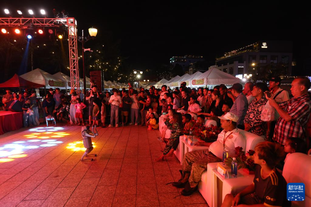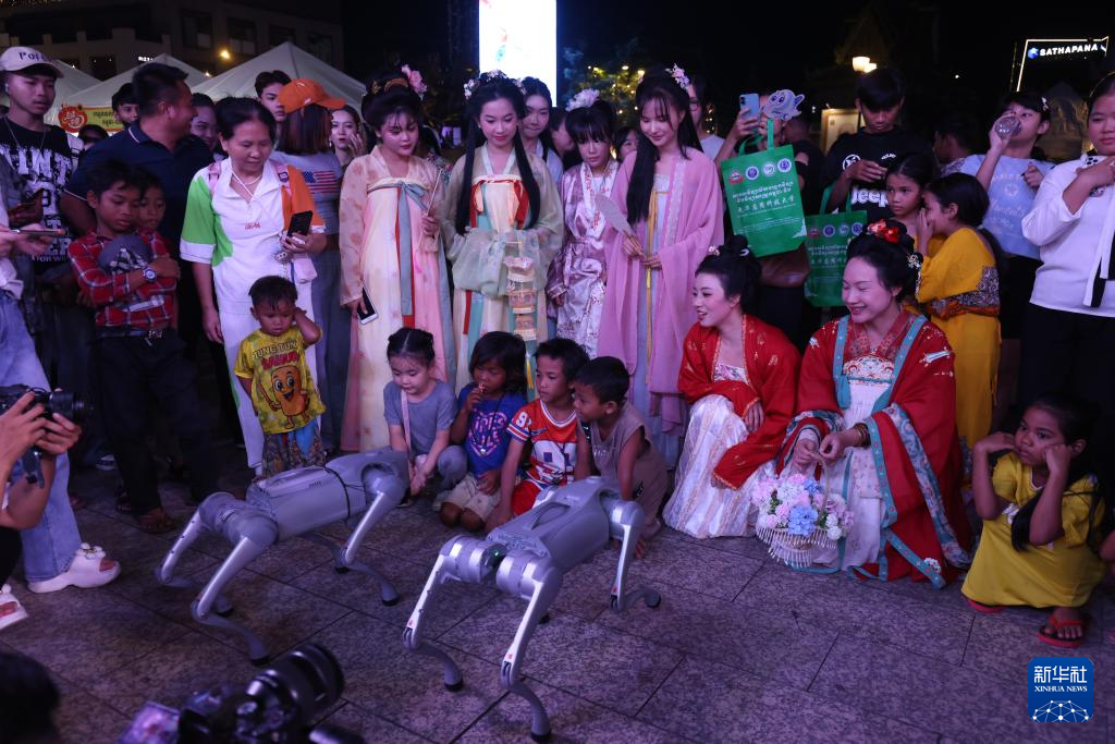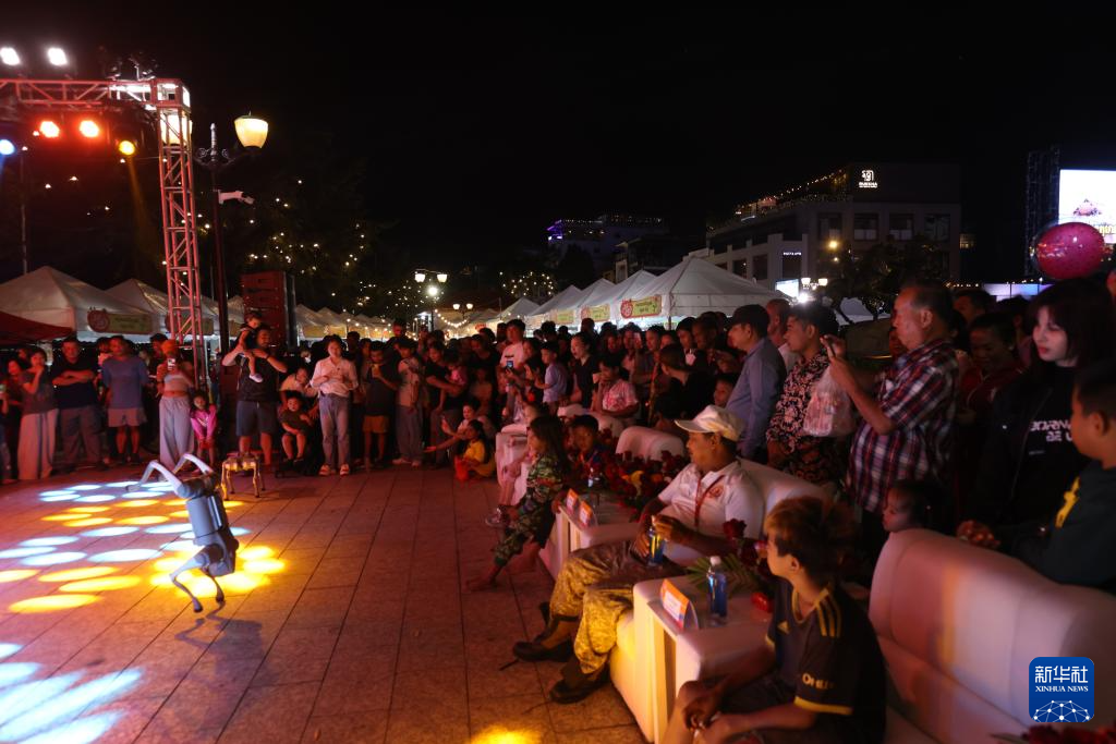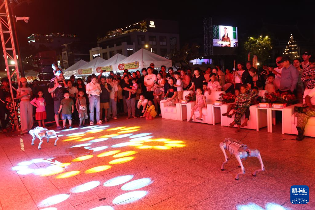 12月14日,在柬埔寨金边,人们在“走读中柬”系列文化活动文化市集上观看机器狗表演。由五洲传播出版传媒有限公司主办的“走读中柬”系列文化活动文化市集13日至14日在柬埔寨首都金边举行。为期两天的活动吸引大量当地民众与各国游客参与。新华社发(萨雷摄)