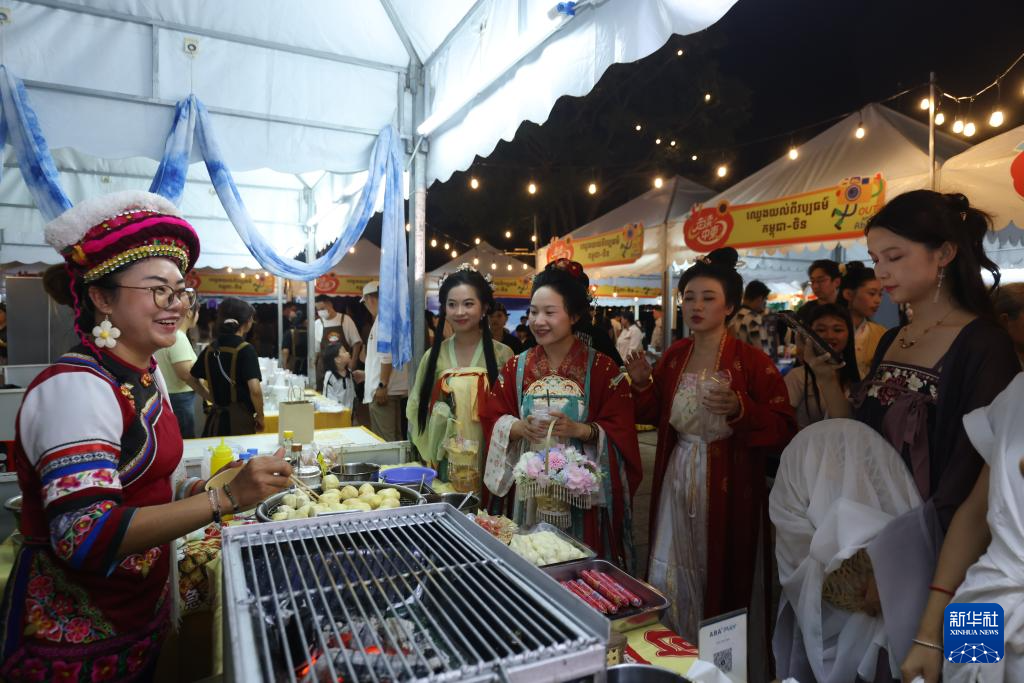 12月14日,在柬埔寨金边,人们在“走读中柬”系列文化活动文化市集上体验中国美食。由五洲传播出版传媒有限公司主办的“走读中柬”系列文化活动文化市集13日至14日在柬埔寨首都金边举行。为期两天的活动吸引大量当地民众与各国游客参与。新华社发(萨雷摄)