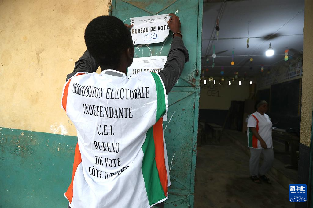 12月27日,在科特迪瓦经济首都阿比让的一处投票站,一名工作人员张贴投票站信息。科特迪瓦国民议会选举投票27日上午在全国展开,将选举产生新一届国民议会共255名议员。初步计票结果将于12月28日至30日公布。科特迪瓦国民议会最终组成名单将于2026年1月16日前公布。新华社发(伊万·宋摄)