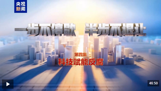 由中央纪委国家监委宣传部与中央广播电视总台央视联合摄制的电视专题片《一步不停歇 半步不退让》,1月14日在总台央视综合频道晚8点档播出第四集《科技赋能反腐》,央视新闻新媒体平台同步播发。