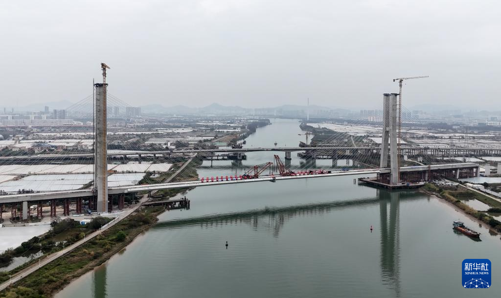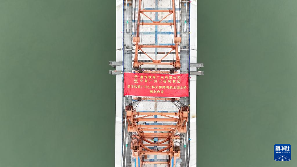 2月10日,深江铁路广中江特大桥跨鸡鸦水道主桥合龙处的钢梁吊装到位(无人机照片)。2月10日,中铁广州工程局集团承建的深江铁路广中江特大桥跨鸡鸦水道主桥顺利合龙,成为深江铁路全线首个实现合龙的主桥。跨鸡鸦水道主桥全长约789米,是深江铁路全线重点控制性工程。深江铁路是我国“八纵八横”高铁网沿海通道的重要组成部分,线路起自深圳西丽站,正线全长约116公里,跨越珠江口,串联深圳、东莞、广州、中山和江门等5座粤港澳大湾区城市。深江铁路建成后,深圳与江门可实现1小时内通达。新华社记者田建川摄