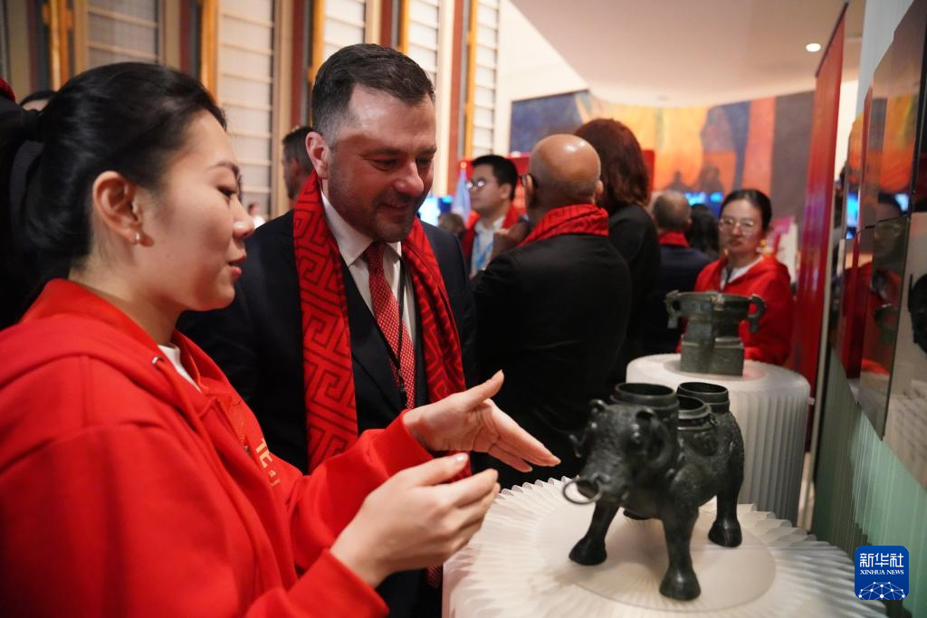 2月9日,在联合国总部举行的“骏启新程”新春庆祝活动上,一名嘉宾听取关于青铜器的讲解。2月9日,中国常驻联合国代表团在位于纽约的联合国总部举办“骏启新程”新春庆祝活动,联合国秘书长古特雷斯在视频致辞中用中文向中国人民致以新春问候,并感谢中国和中国人民对多边主义和全球团结事业的大力支持。新华社记者张凤国摄