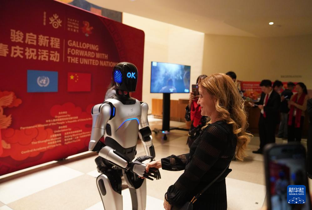 2月9日,“中国智造”机器人在联合国总部举行的“骏启新程”新春庆祝活动上表演舞蹈。2月9日,中国常驻联合国代表团在位于纽约的联合国总部举办“骏启新程”新春庆祝活动,联合国秘书长古特雷斯在视频致辞中用中文向中国人民致以新春问候,并感谢中国和中国人民对多边主义和全球团结事业的大力支持。新华社记者张凤国摄